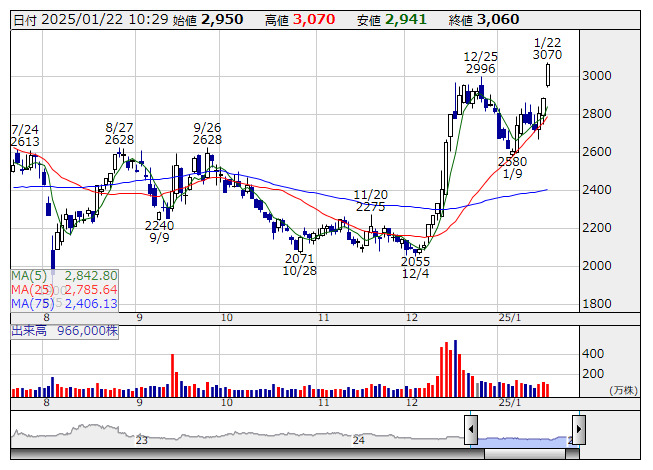 ANYCOLOR<5032>が大幅高で3連騰、フシ目の3000円大台を回復した。3000円台乗せは昨年3月中旬以来で約10カ月ぶりとなる。VTuberグループの「にじさんじ」を運営し、業績は時流を捉え高成長トレンドを走っている。市場では「グッズ販売も好調なほか拡大規模が約3倍となった新スタジオ効果などが注目されている。にじさんじ史上初となる武道館ライブを5月に開催することも決まったもようで、株価の上昇余地が大きい」(中堅証券ストラテジスト)という。また、「21日付で野村証券が『Buy』で新規カバレッジしており目標株価を3800円に設定していることも目先物色人気を増幅しているもよう」(同)としている。